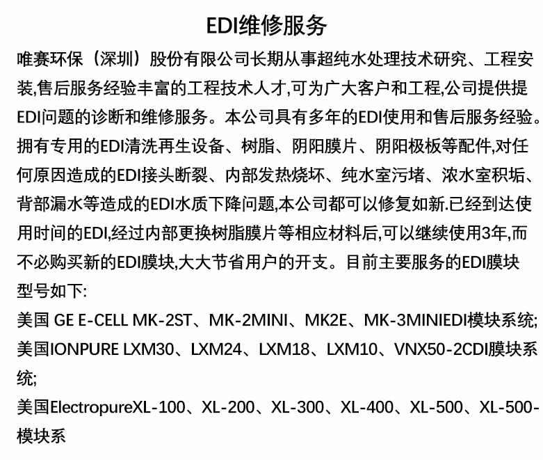 唯賽環(huán)保長(zhǎng)期從事超純水處理技術(shù)研究、工程安裝,售后服務(wù)經(jīng)驗(yàn)豐富的工程技術(shù)人才,可為廣大客戶和工程公司提供提EDI問(wèn)題的診斷和維修服務(wù)。本公司具有多年的EDI使用和售后服務(wù)經(jīng)驗(yàn)